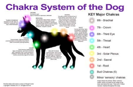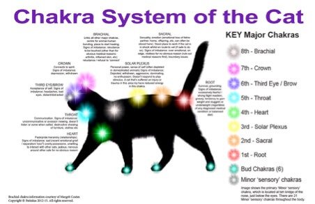 All animals have an Etheric Chakra System just like humans. Most animals have 8 Major chakras, up to 21 Minor chakras and 6 smaller energy points known as Bud chakras. (4 paw pads, and the bud of skin at the opening of the ears). Alongside the seven Major chakras that animals share with humans (Crown, Third Eye/Brow, Throat, Heart, Solar Plexus, Sacral and Root), there is another Major chakra which is unique to animals. It is called the Brachial or Key chakra. Most animals have 8 major active chakras which play an important role in their general behaviour.